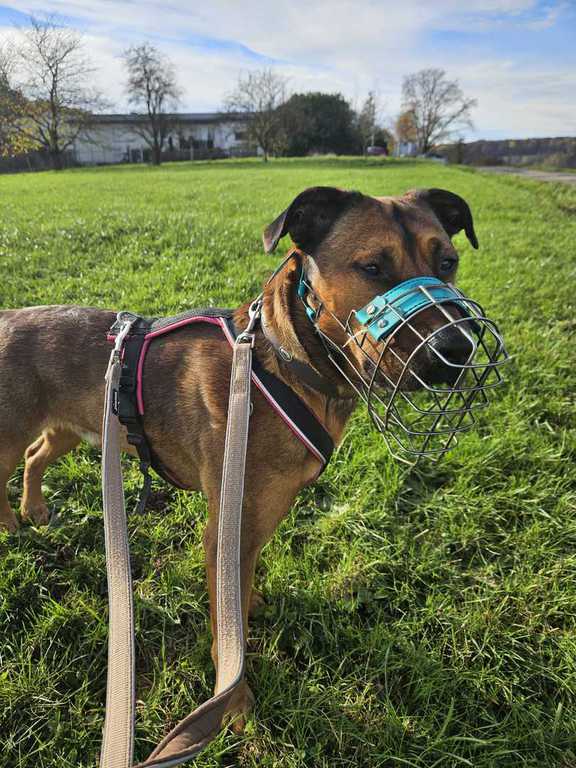 Brustgeschirr. Das soll verhindern, dass ich verlorengehe, wenn ich mich erschrecke, und um dieses Brustgeschirr geht es nun. Als ich hier ankam, wurde im Second Hand-Sortiment des Hundehauses nach