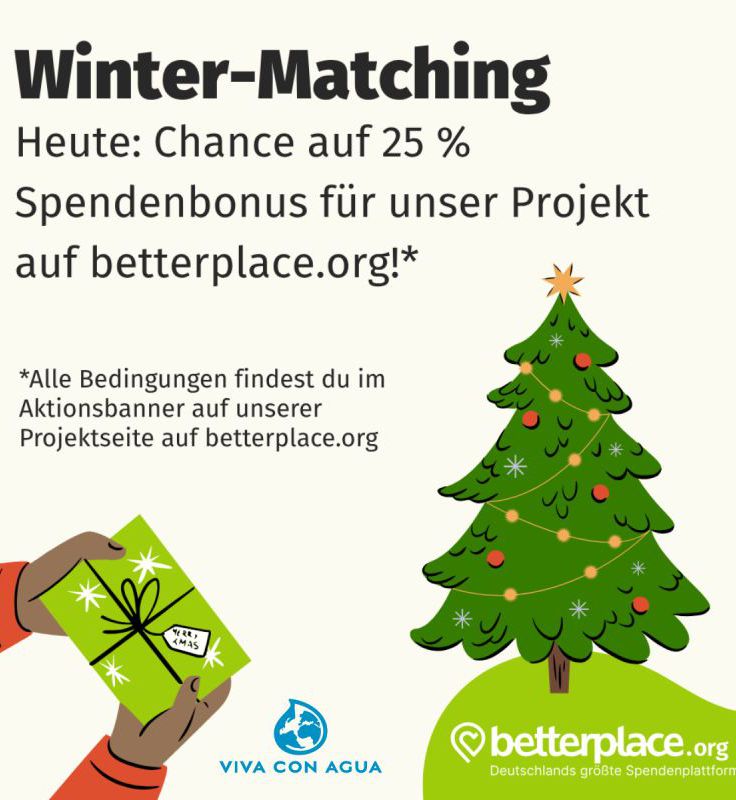 Heute von 9:00-23:59 Uhr findet bei Betterplace eine Winter-Matching-Aktion statt: auf jede Einzelspende legt Betterplace 25% obendrauf. Der maximale Bonus beträgt 25 € pro Spende, solange das Aktionsbudget von 10.000 € für diesen Sonntag nicht aufgebraucht ist. Unsere beiden Spendenprojekte bei Betterplace finden Sie hier: